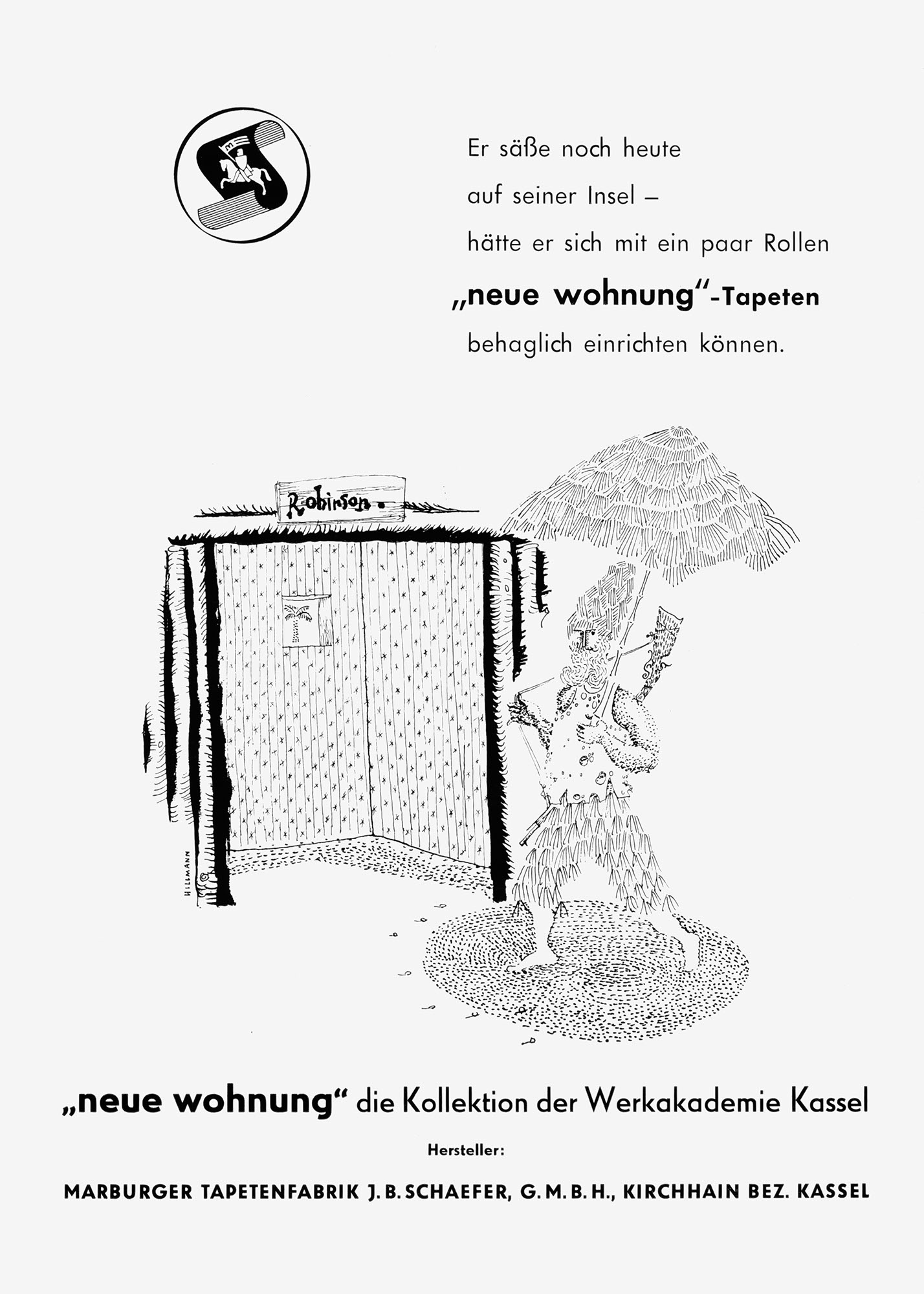 Im Rahmen einer Kooperation der Werkakademie Kassel mit der Marburger Tapetenfabrik gestaltete Prof. Hans Leistikow 1952 eine Kollektion von Tapetenmustern unter dem Namen »Neue Wohnung«. Hans Hillmann, damals Meisterschüler bei Leistikow, erhielt den Auftrag eine Serie von acht Illustrationen für Werbeanzeigen anzufertigen, die zwischen Sommer 1952 und Frühjahr 1953 u.a. in Fachmagazinen wie der »Tapeten-Zeitung« geschaltet wurden. Bei den Anzeigen, die historische oder literarische Figuren humorvoll mit den neuen Kassler Tapeten in Verbindung brachten, handelt es sich vermutlich um die allerersten Auftragsarbeiten von Hillmann.
