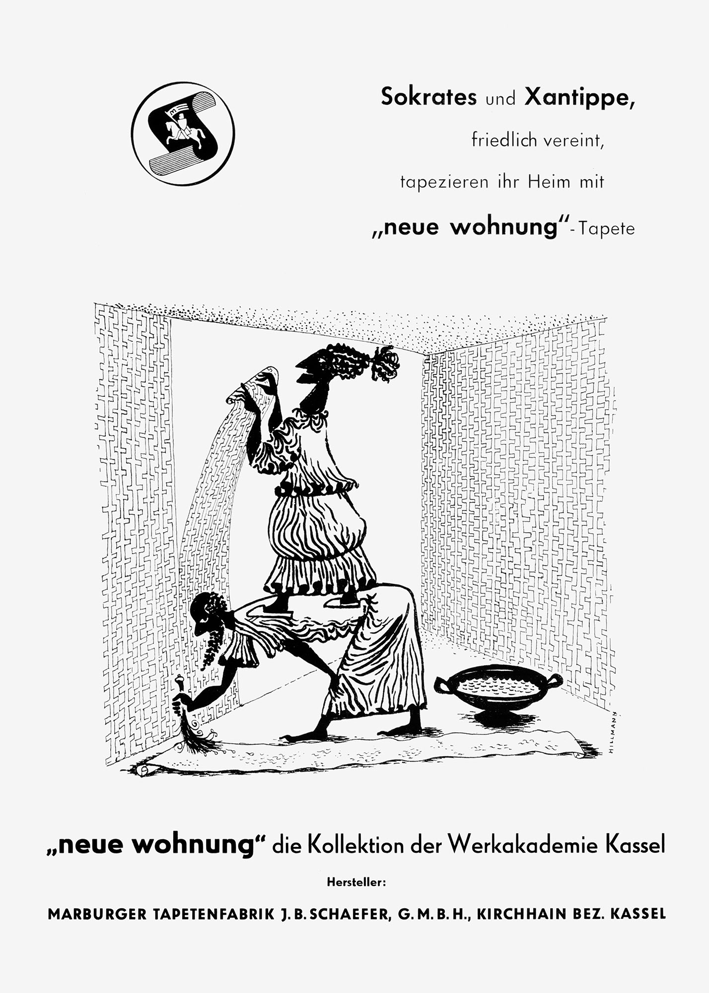 Im Rahmen einer Kooperation der Werkakademie Kassel mit der Marburger Tapetenfabrik gestaltete Prof. Hans Leistikow 1952 eine Kollektion von Tapetenmustern unter dem Namen »Neue Wohnung«. Hans Hillmann, damals Meisterschüler bei Leistikow, erhielt den Auftrag eine Serie von acht Illustrationen für Werbeanzeigen anzufertigen, die zwischen Sommer 1952 und Frühjahr 1953 u.a. in Fachmagazinen wie der »Tapeten-Zeitung« geschaltet wurden. Bei den Anzeigen, die historische oder literarische Figuren humorvoll mit den neuen Kassler Tapeten in Verbindung brachten, handelt es sich vermutlich um die allerersten Auftragsarbeiten von Hillmann.