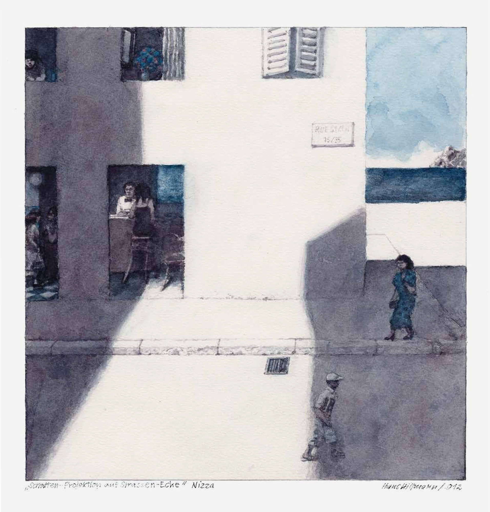Nizza Schatten-Projektion auf Straßen-EckeJahr: 2012Medium: IllustrationMaße: 21x22 cmTechnik: AquarellzeichnungAuftraggeber: EigenauftragOrt: Frankfurt am MainKeine Beschreibung