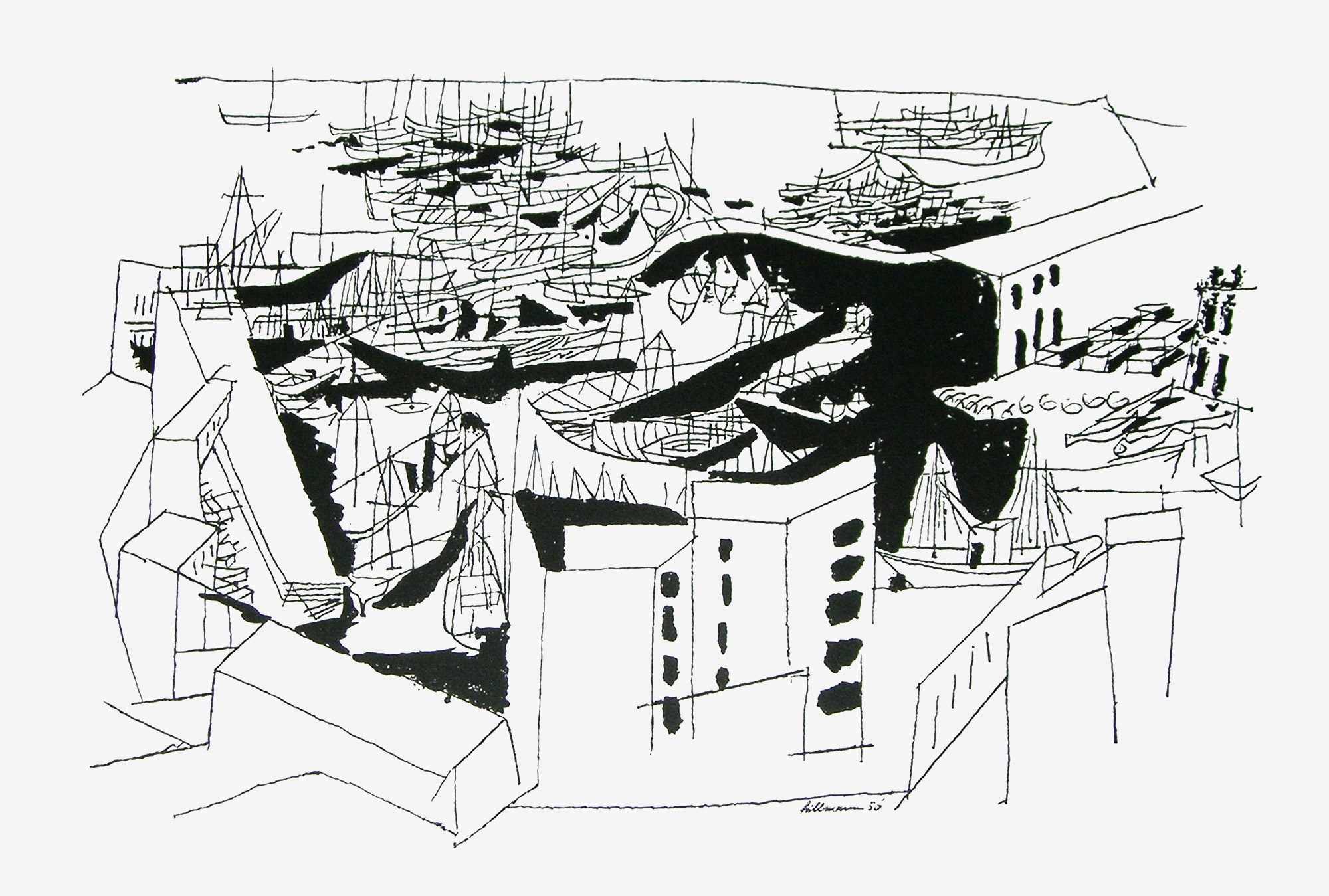 Zeichnung von Hillmann, die bei einer Reise nach Italien in den frühen 1950er-Jahren entstand und die 1956 als Siebdruck-Edition aufgelegt wurde.