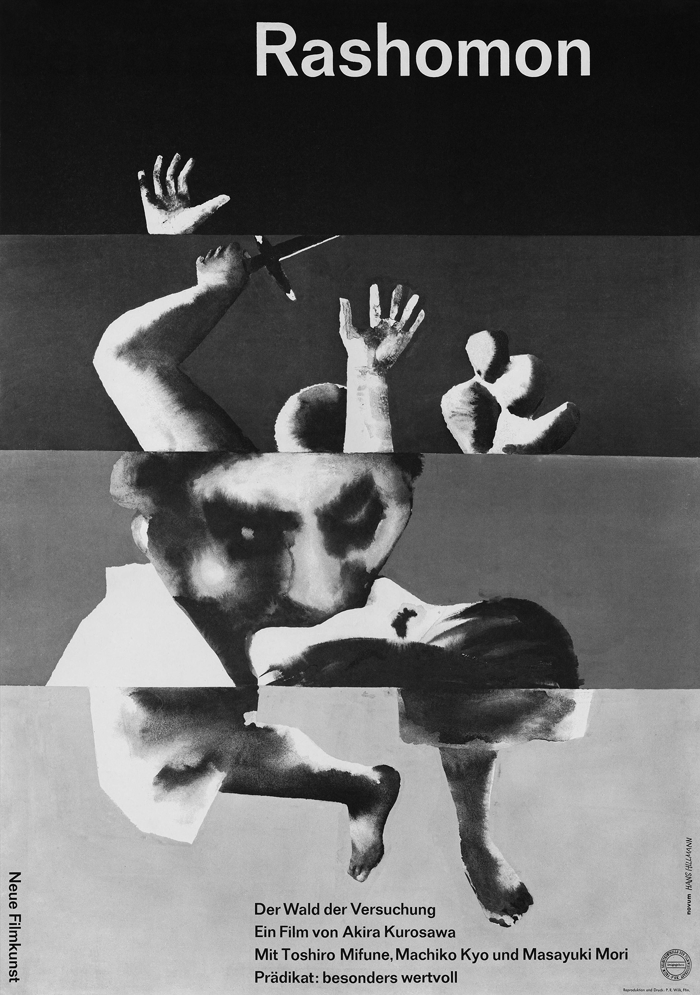 In »Rashomon«, der vierfachen Erzählung der gleichen Begebenheit durch die vier daran Beteiligten, wird das Hochformat waagerecht viergeteilt. In jedem der Felder sind Ausschnitte und Gesten von menschlichen Figuren dargestellt. Sie sind so übereinander montiert, daß sich der Eindruck von nur einer bewegten Figur ergibt, die in sich dem komplizierten Sachverhalt des Films entspricht. (Hans Hillmann)