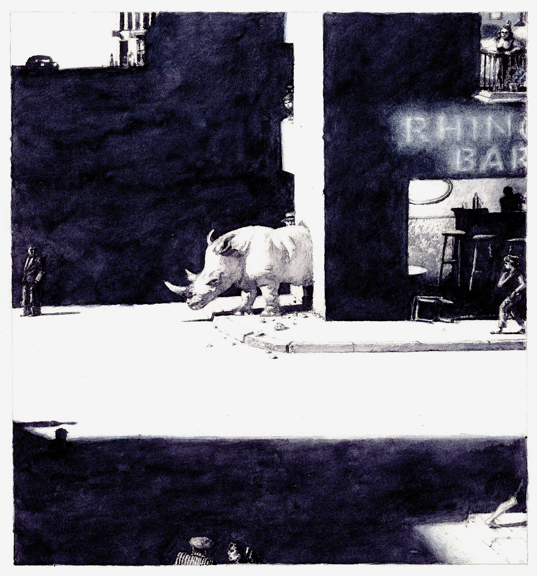 Rhino BarJahr: 2007Medium: IllustrationMaße: 29x31 cmTechnik: AquarellzeichnungAuftraggeber: EigenauftragOrt: Frankfurt am MainKeine Beschreibung