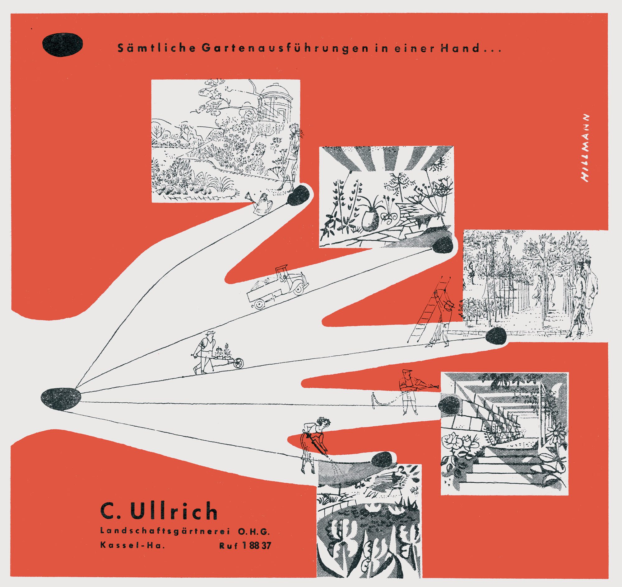 Sämtliche Gartenausführungen in einer Hand…Jahr: 1955Medium: AnzeigeMaße: 20,5x19,5 cmTechnik: BuchdruckAuftraggeber: C. Ullrich LandschaftsgärtnereiOrt: KasselErschienen in einem von Hillmann gestalteten Katalog zur Bundesgartenschau Kassel 1955.