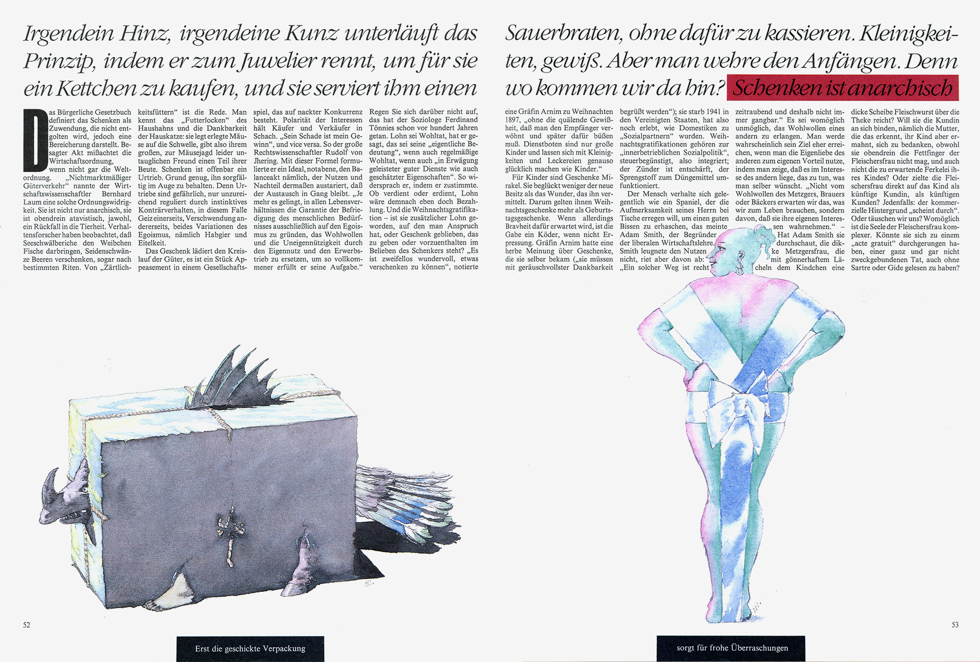 Schenken ist subversivJahr: 1990Medium: MagazinillustrationMaße: 45x30,5 cmTechnik: TiefdruckAuftraggeber: Frankfurter Allgemeine MagazinOrt: Frankfurt am MainArt Direktion: Hans-Georg Pospischil.