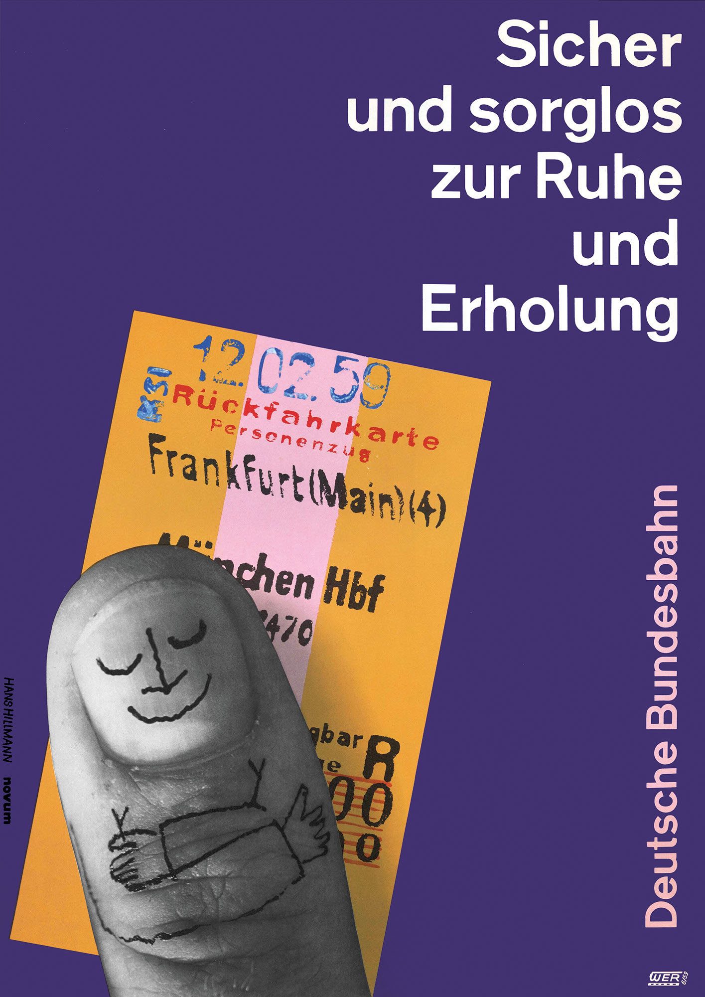 Sicher und sorglos zur Ruhe und ErholungJahr: 1959Medium: PlakatMaße: 59,4x84,1 cm (DIN A1)Technik: OffsetdruckAuftraggeber: Deutsche BundesbahnOrt: Frankfurt am MainKeine Beschreibung