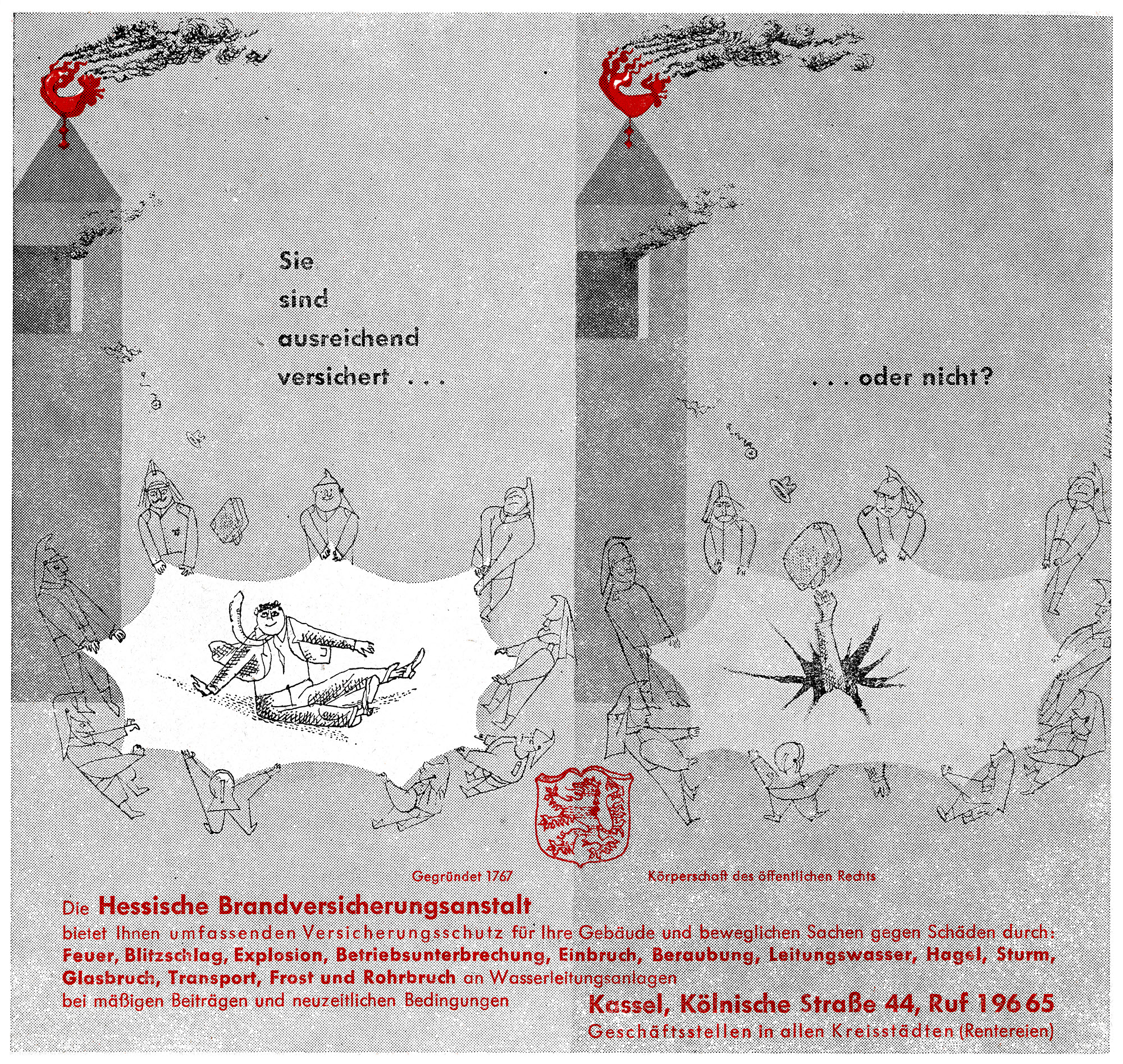 Sie sind ausreichend versichert… oder nicht?Jahr: 1955Medium: AnzeigeMaße: 19x18 cmTechnik: BuchdruckAuftraggeber: Hessische BrandversicherungsanstaltOrt: KasselErschienen in einem von Hillmann gestalteten Katalog zur Bundesgartenschau Kassel 1955.