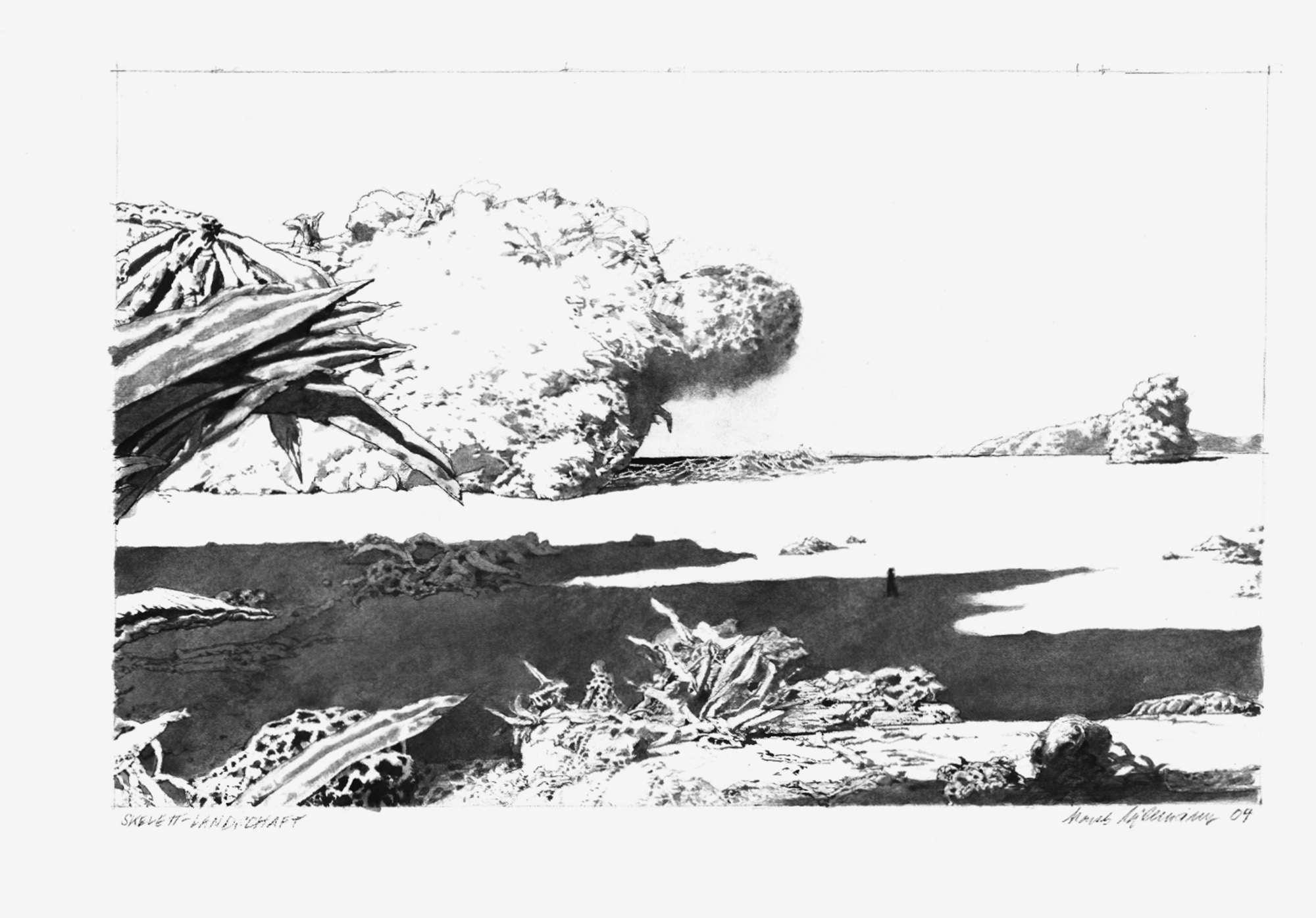 Skelett-LandschaftJahr: 2004Medium: IllustrationMaße: 26x18 cmTechnik: AquarellzeichnungAuftraggeber: EigenauftragOrt: Frankfurt am MainKeine Beschreibung