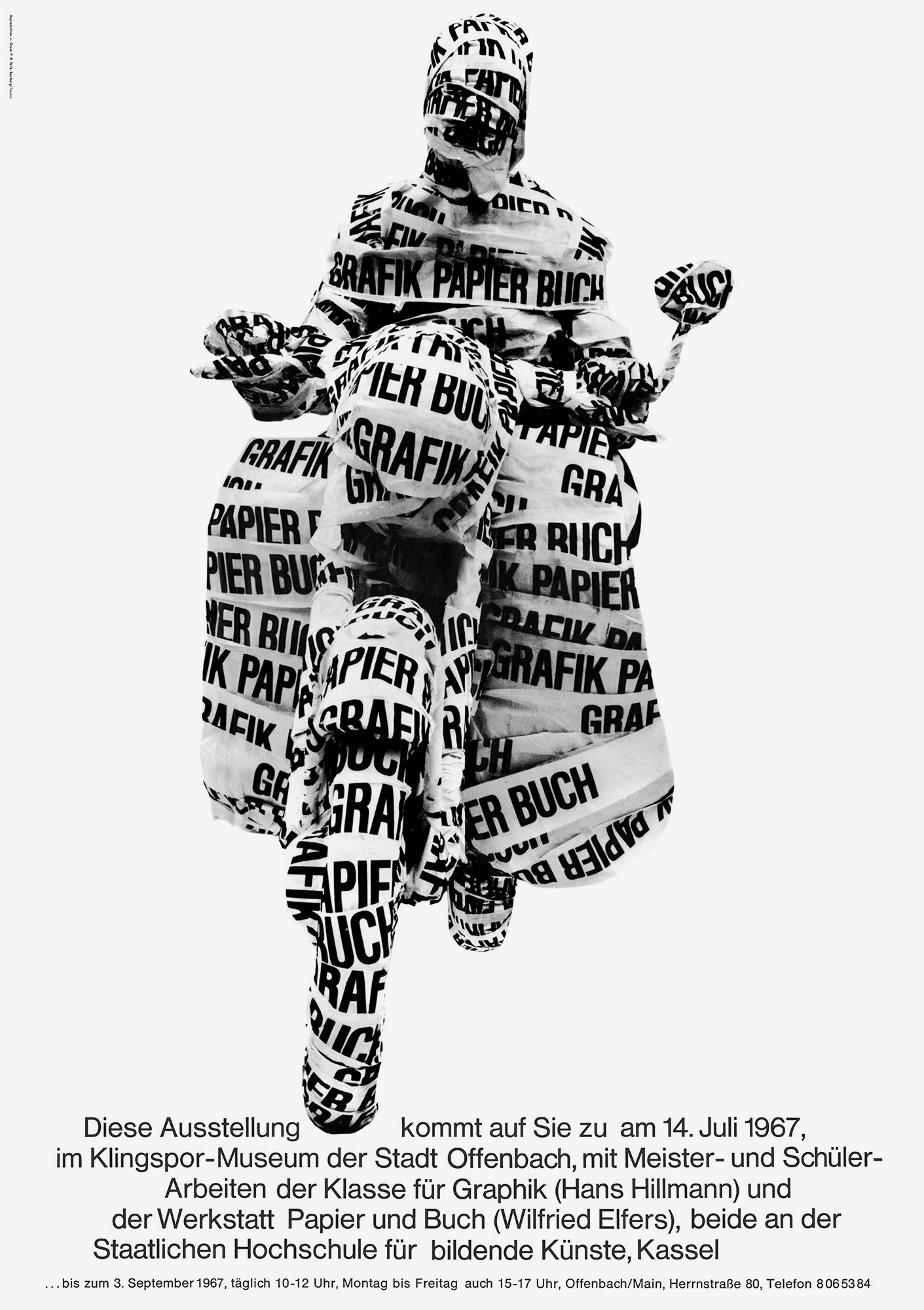 Das Plakat wurde von Marlies Rosa und Peter Bräutigam anlässlich einer Ausstellung von Studierendenarbeiten aus den Klassen Hans Hillmann und Wilfried Elfers der Staatlichen Hochschule für bildende Künste Kassel im Klingspor-Museum in Offenbach entworfen.
