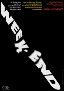 Week-End (Entwurf)Jahr: 1969Medium: EntwurfTechnik: AquarellzeichnungAuftraggeber: Neue Filmkunst Walter KirchnerOrt: GöttingenEntwurf für eine Innenseite des Programmhefts.