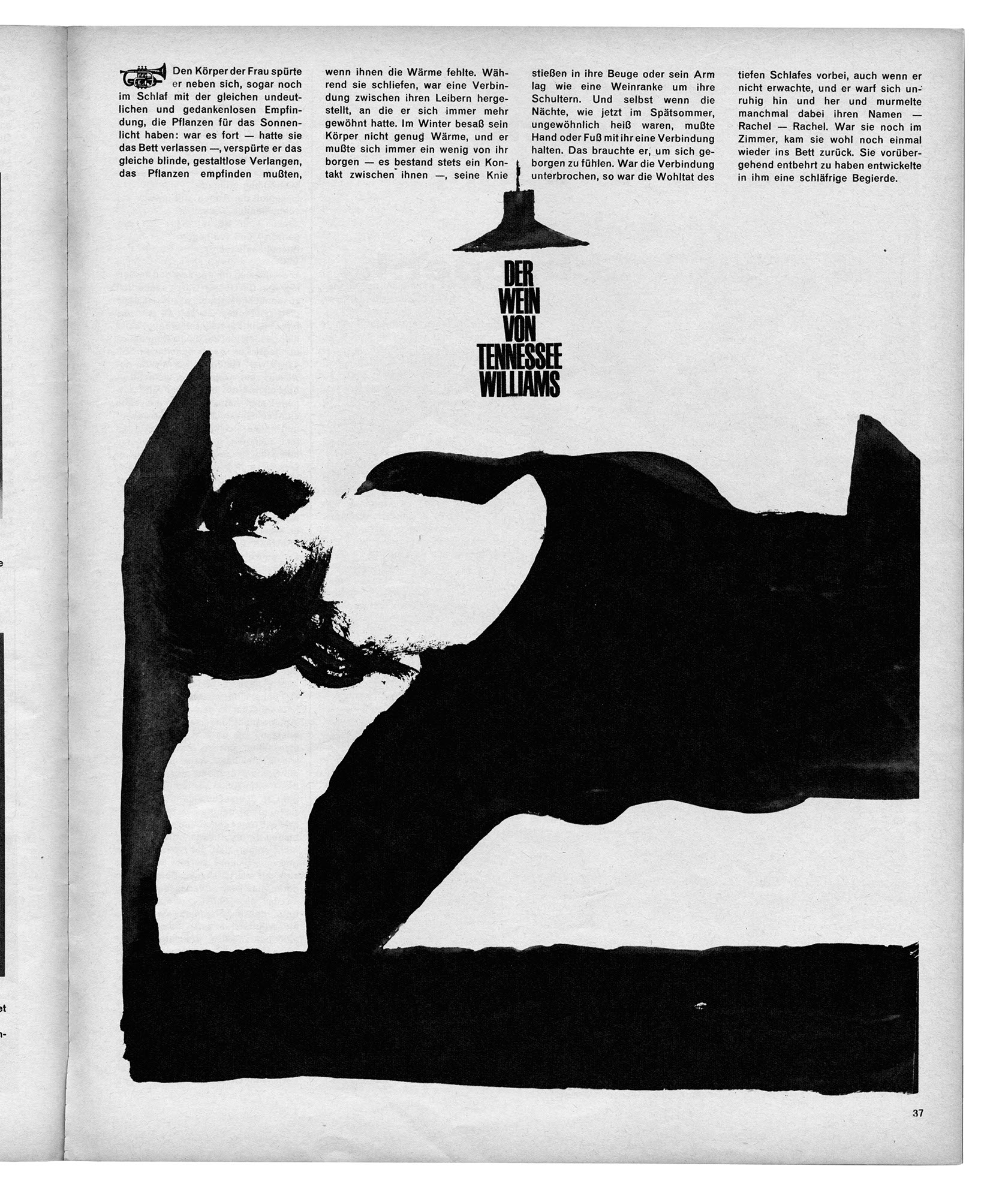 Wein von Tennessee WilliamsJahr: 1964Medium: MagazinillustrationMaße: 26,5x33,5 cmTechnik: TiefdruckAuftraggeber: TwenOrt: KölnAus twen Nr. 04-1964. Art Director: Willy Fleckhaus.