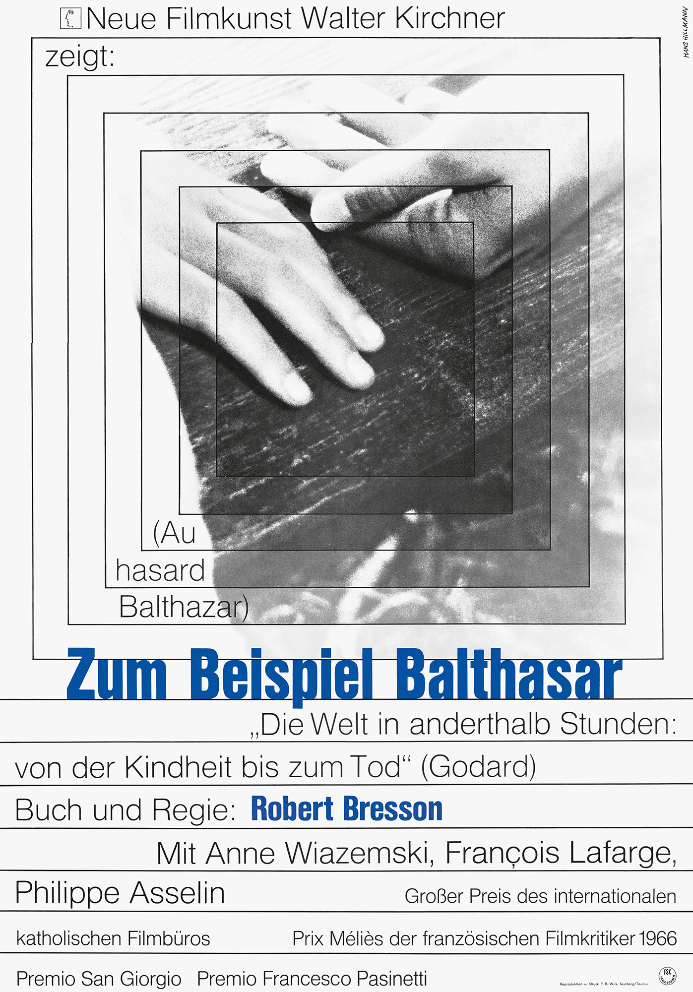 Zum Beispiel BalthasarJahr: 1967Medium: PlakatMaße: 59,4x84,1 cm (DIN A1)Technik: OffsetdruckAuftraggeber: Neue Filmkunst Walter KirchnerOrt: GöttingenKeine Beschreibung