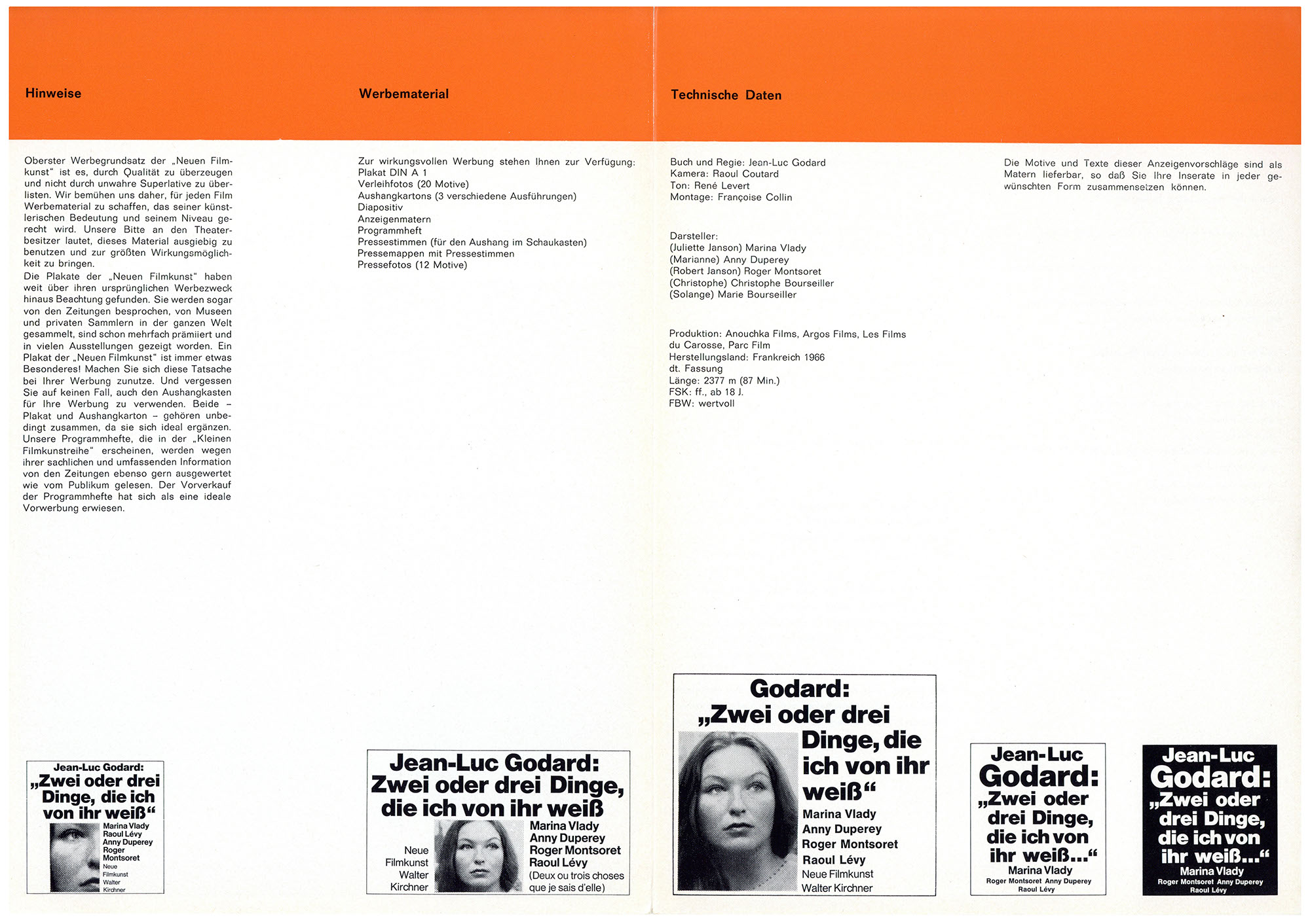 Zwei oder drei Dinge, die ich von ihr weiß… (Werberatschlag)Jahr: 1968Medium: BroschüreMaße: 21x29,7 cmTechnik: OffsetdruckAuftraggeber: Neue Filmkunst Walter KirchnerOrt: GöttingenKeine Beschreibung