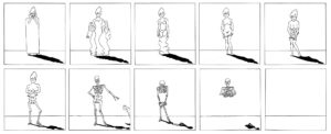 Hans Hillmanns lebenslage Begeisterung für das Medium Film schlug sich auch in seiner Arbeit als Illustrator nieder. Immer wieder realisierte er selbstinitiierte Buchprojekte, bei denen er die Mittel filmischen Erzählens in Zeichnungen transformierte. So gelang es ihm in seinen »Bildergeschichten« eine überraschende Handlung mit nur wenigen monochromen Zeichnungen umzusetzen.